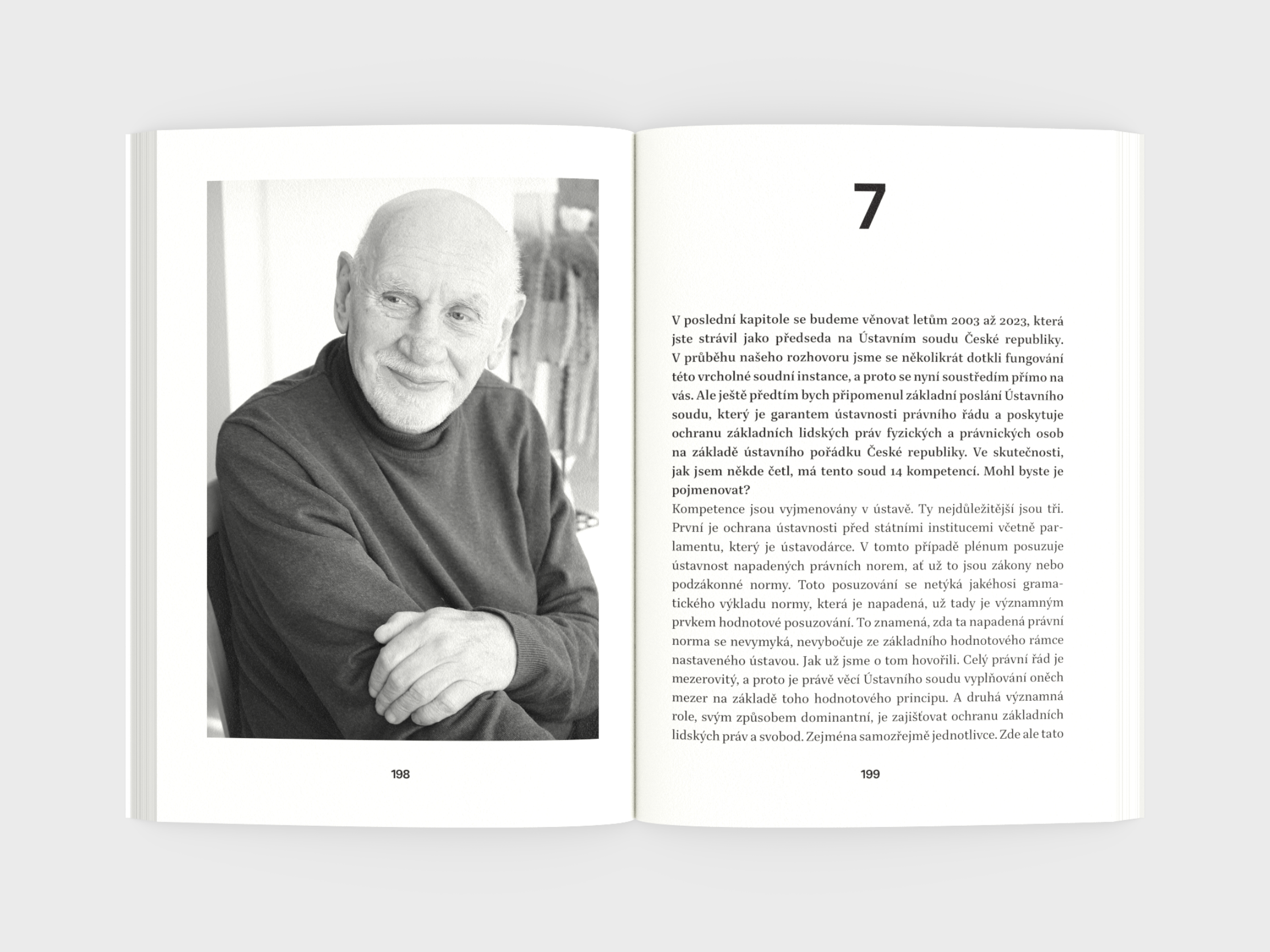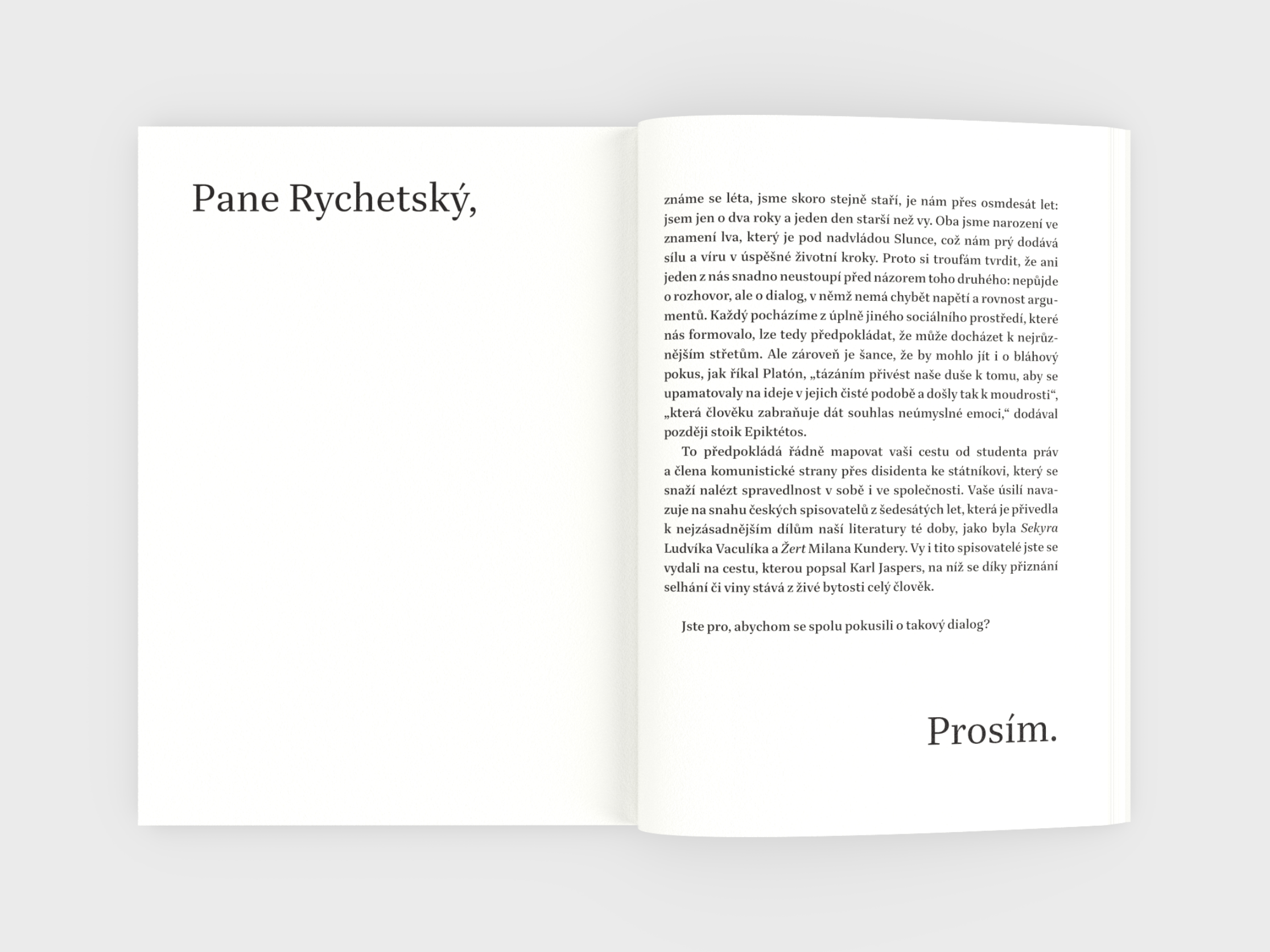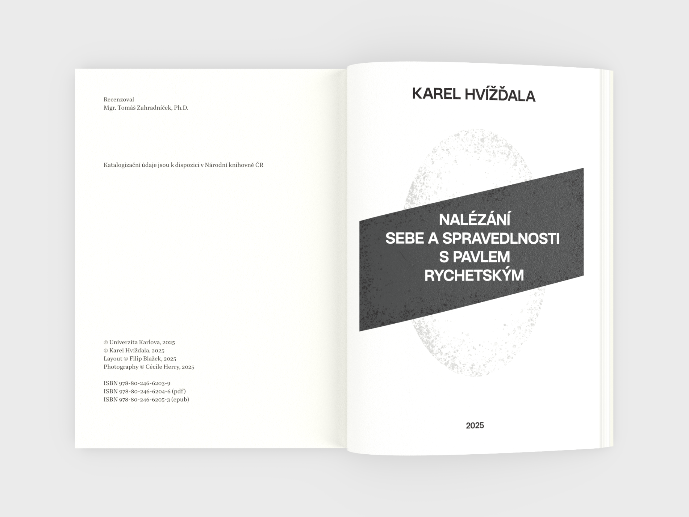 Drobná kniha nakladatelství Karolinum s celým názvem Nalézání sebe a spravedlnosti s Pavlem Rychetským přináší sedm kapitol rozhovoru novináře Karla Hvížďaly se známým právníkem. Titul je brožovaný, má 220 stran a je doplněn fotografiemi Cécile Herry. Obálka je symbolickou hrou na téma spravedlnosti.